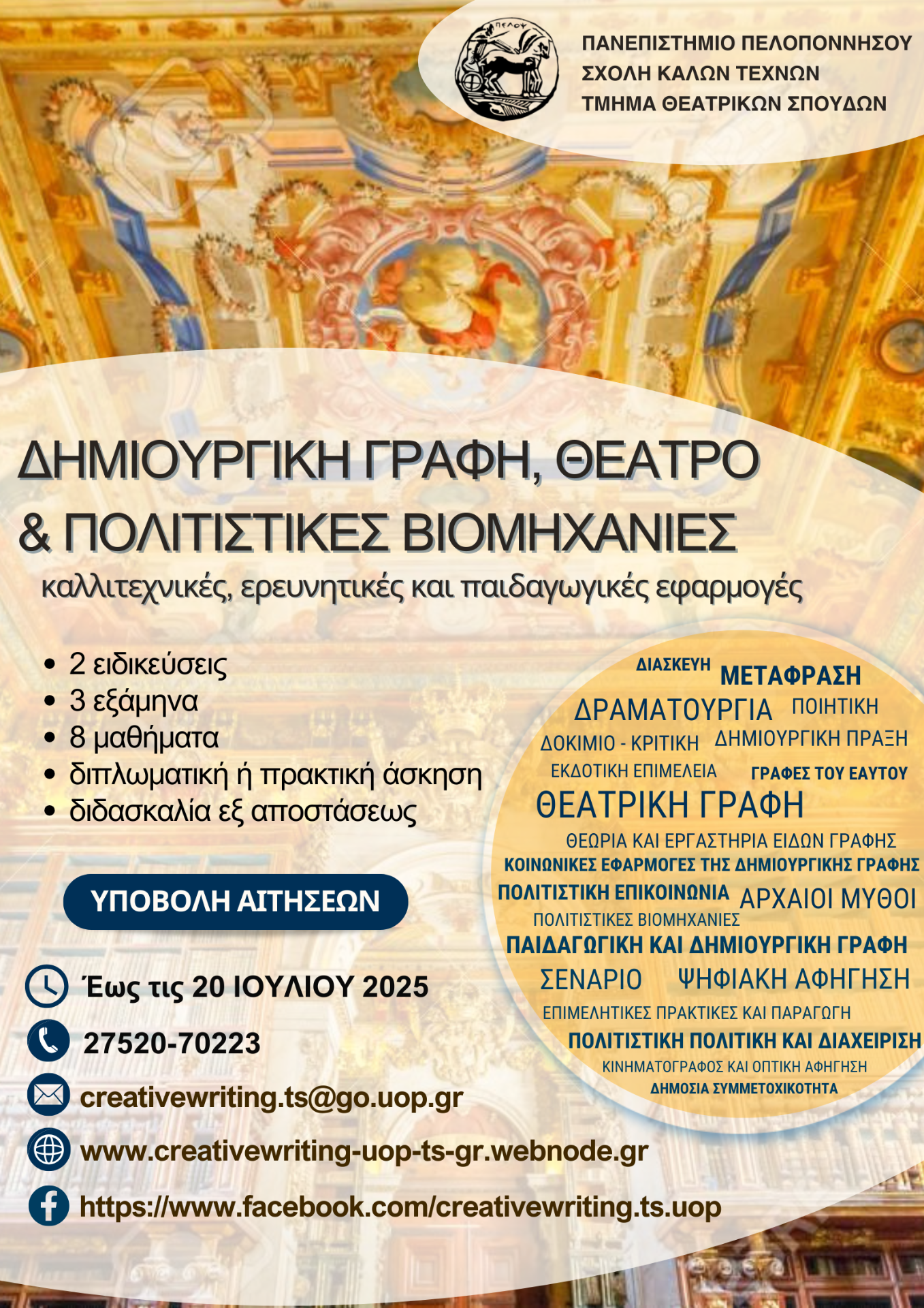 Για πληροφορίες και υποβολή αίτησης ενδιαφέροντος επικοινωνήστε στη διεύθυνση: creativewriting.ts@uop.gr