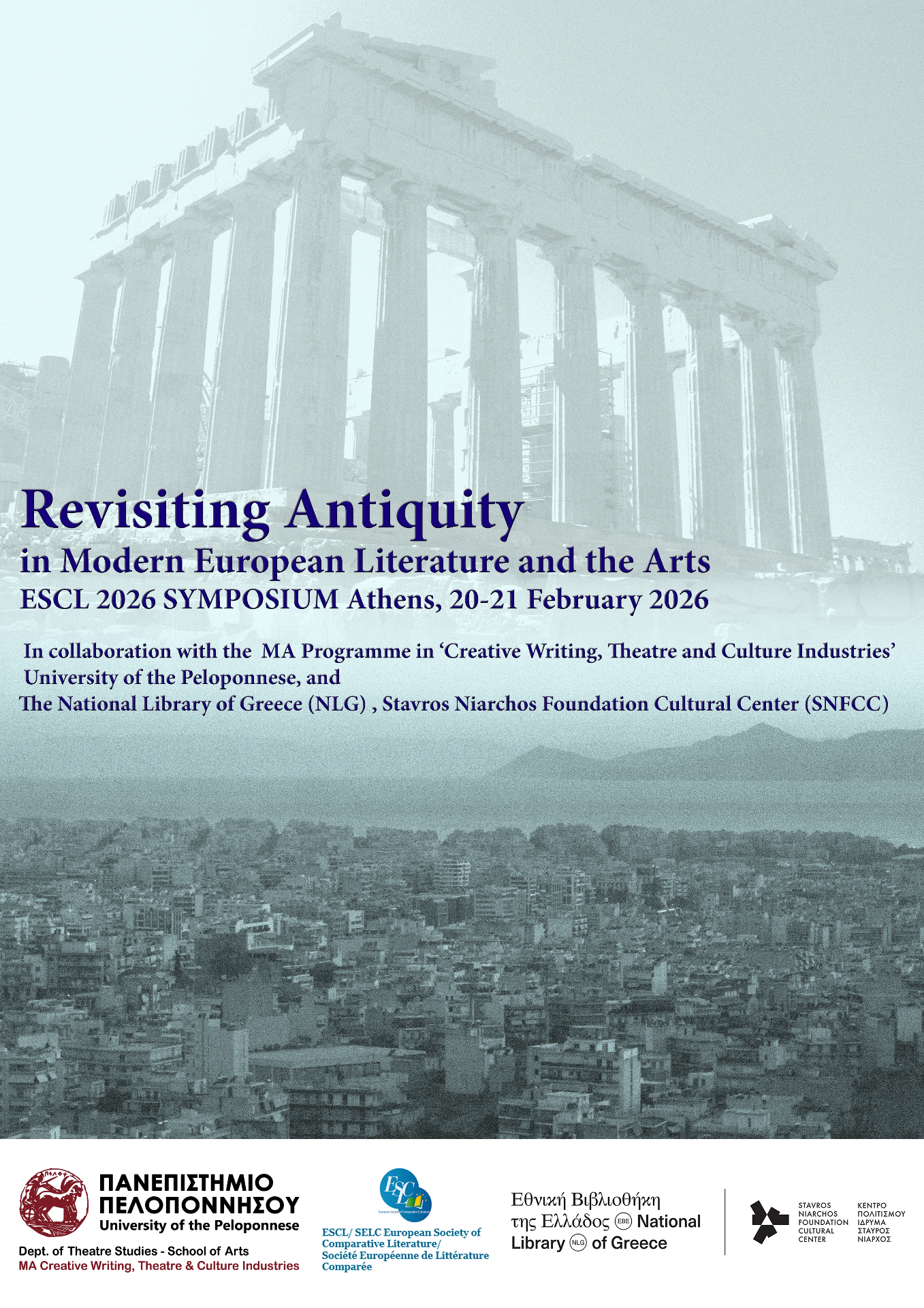 Σας προσκαλούμε στο ΔΙΕΘΝΕΣ ΣΥΜΠΟΣΙΟ της Ευρωπαϊκής Εταιρείας Συγκριτικής Λογοτεχνίας ( ESCL) με θέμα "Επισκέψεις της αρχαιότητας στην νεώτερη Ευρωπαϊκή λογοτεχνία και τις τέχνες" & το 2ο ΦΕΣΤΙΒΑΛ του Μεταπτυχιακού «Δημιουργική Γραφή, Θέατρο και Πολιτιστικές Βιομηχανίες» του Πανεπιστημίου Πελοποννήσου με έργα νέων συγγραφέων και θέμα "σύγχρονες γραφές", σε συνεργασία με την Εθνική Βιβλιοθήκη της Ελλάδος, στις 20-22 Φεβρουαρίου 2026, στην ΕΒΕ, ΚΠΙΣΝ